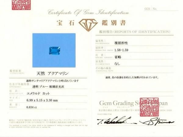 エメラルドカットサンタマリアアクアマリン ダイヤモンドリング AQ 0.834ct D 0.43ct Pt950 GGSJ鑑別書付