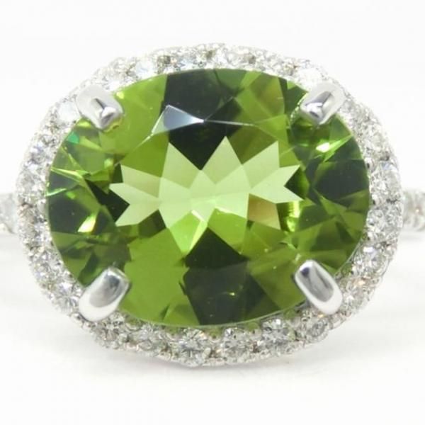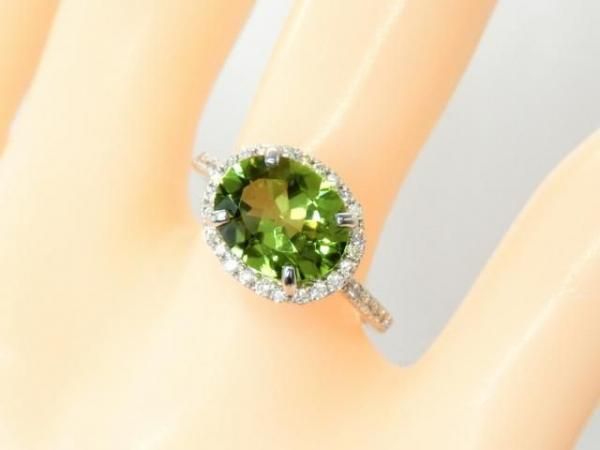 リングはペリドットの周囲をカラーレスダイヤモンドで取り巻いた華やかなデザイン。
