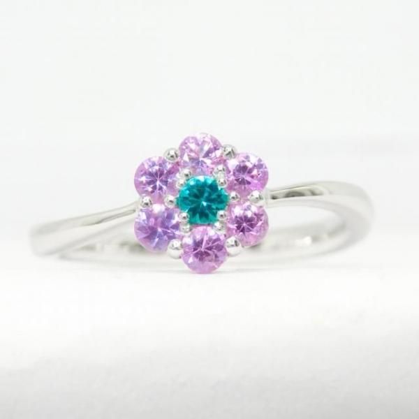 パライバトルマリンの鮮やかなネオンカラーとパープルサファイアの可憐な紫が生み出す独特なコントラストが素晴らしい作品です。